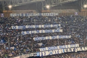 踢罗马前,那不勒斯球迷拉横幅支持球队:你们捍卫球衣和城市荣誉