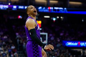 上半场比拼,威少出战16分钟,6投5中,三分3中3,罚球2中0,得13分3板4助。