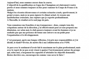 因此,经过深思熟虑,我承担起责任,于2月9日星期一决定终止与马赛俱乐部的合作。我离开时感到自己在职业层面已竭尽全力,很遗憾未能平息球队周围的环境,但我认为这支队伍完全有能力实现既定目标。请继续支持他们,用你们一贯的方式为他们加油!