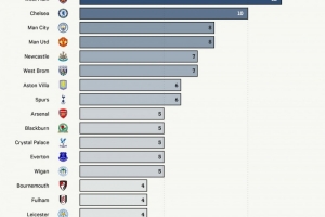 第二、第三名分别为桑德兰和西汉姆,均为12次,紧随其后的则是切尔西、曼城和曼联。
