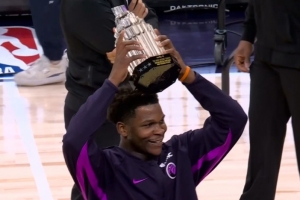 体育资讯2月21日讯 森林狼主场迎战独行侠,赛前,爱德华兹在主场向球迷们展示全明星MVP奖杯,接受球迷们的欢呼。