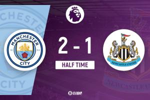 半场-曼城暂2-1纽卡 奥赖利双响哈兰德、马尔穆什送助攻