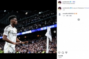 他也在赛后通过社媒晒出自己模仿詹姆斯的经典双手下压庆祝照,并配文:“在主场,在欧冠!!@皇家马德里 🤍”