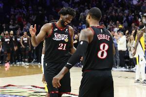 本场比赛恩比德出战29分钟,24投11中,三分4中1,罚球6中6,得29分9板(6个前场篮板)5助1断;乔治出战33分钟,21中11,三分15中9,罚球2中1砍下32分5篮板5助攻2抢断,正负值+13。