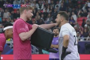 比赛第74分钟,野兽先生所在的球队获得点球机会,此时他们5比7落后,他们有望将分差缩小至1分。