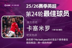 2025-2026赛季英超火热进行中,体育资讯和咪咕体育联合发起每轮英超最佳球员评选活动!第24轮评选结果已经出炉,曼联中场卡塞米罗当选!这也是舍什科、B费、库尼亚之后,曼联球员连续4轮蝉联本奖项。
